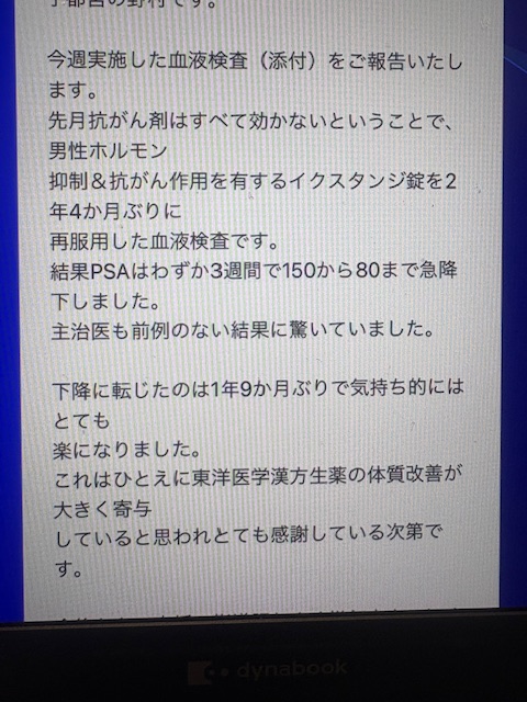 ・下記写真は以前60代男性からのメール。全ての抗がん剤治療で効果がなく、PSAが下がらない時3週間の漢方併用でPSAは150→80まで下がり、主治医も驚いた。