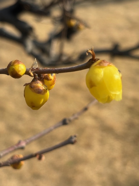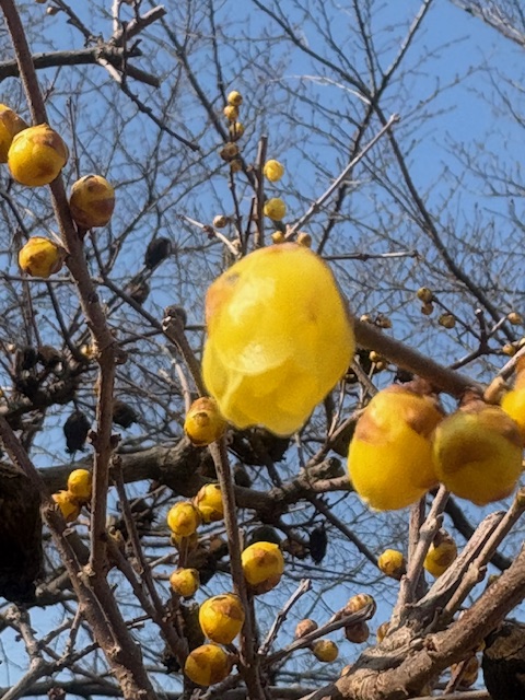 ※一つの疑問があり、蝋梅はいつも先に咲くハズなのに、写真の通り満開の紅梅と白梅より遅く、まだ蕾です。何故でしょう?気候、気温かな…